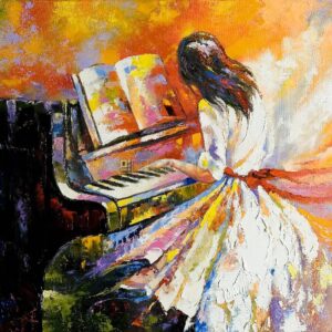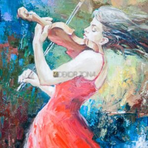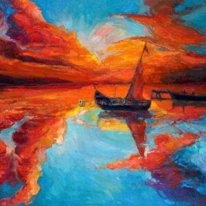 Apstraktna slika snažne dinamike u kombinaciji toplih crvenih tonova, pastelnih preliva i ručno rađenih zlatnih…