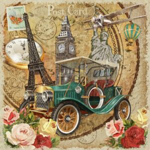 Stilizovana umetnička scena u retro duhu — dama u elegantnoj toaleti i mali pas poziraju…