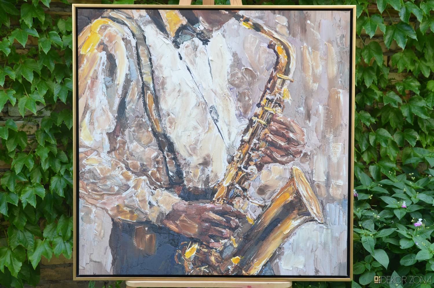 Dinamična umetnička scena koja prikazuje saksafonistu u punom ritmu. Bogata tekstura i topli tonovi daju dojam pokreta i emocije, idealno za ljubitelje muzike i modernog enterijera.