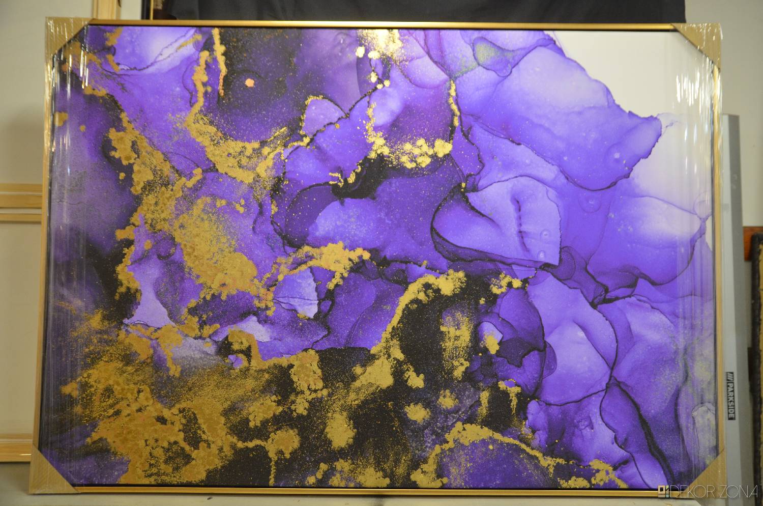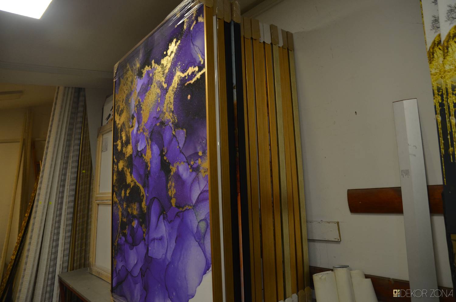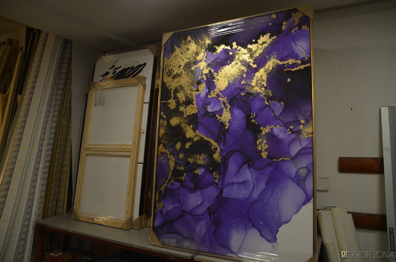 Upečatljiva apstraktna slika u bogatim ljubičastim tonovima, naglašena ručno rađenim zlatnim detaljima koji joj daju luksuzan i dramatičan karakter. Savršen dekor za moderne enterijere koji traže izrazitu vizuelnu energiju.