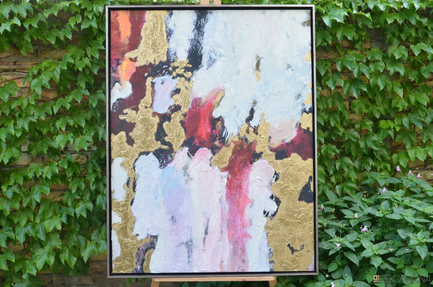 Apstraktna slika snažne dinamike u kombinaciji toplih crvenih tonova, pastelnih preliva i ručno rađenih zlatnih akcenata. Tekstura i kontrasti stvaraju bogat, moderan i izražajan vizuelni utisak — idealno za enterijere kojima je potrebna umetnička toplina i luksuzan sjaj.