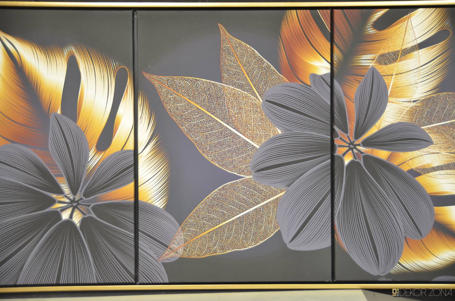Elegantni triptih u crnoj i zlatnoj paleti, sa stilizovanim listovima i cvetovima koji stvaraju snažan…