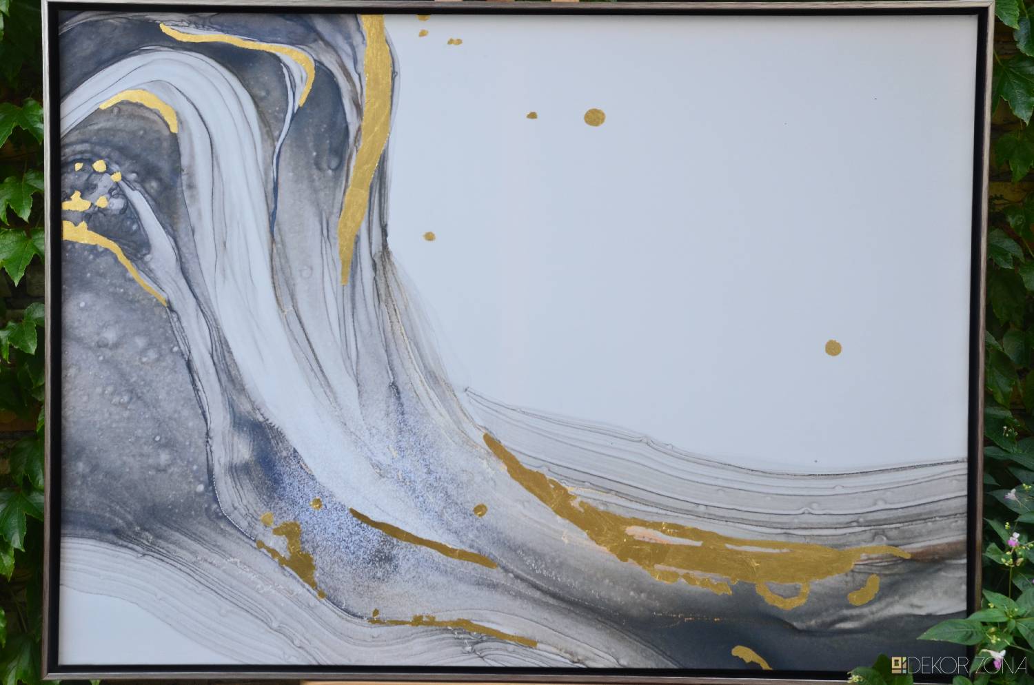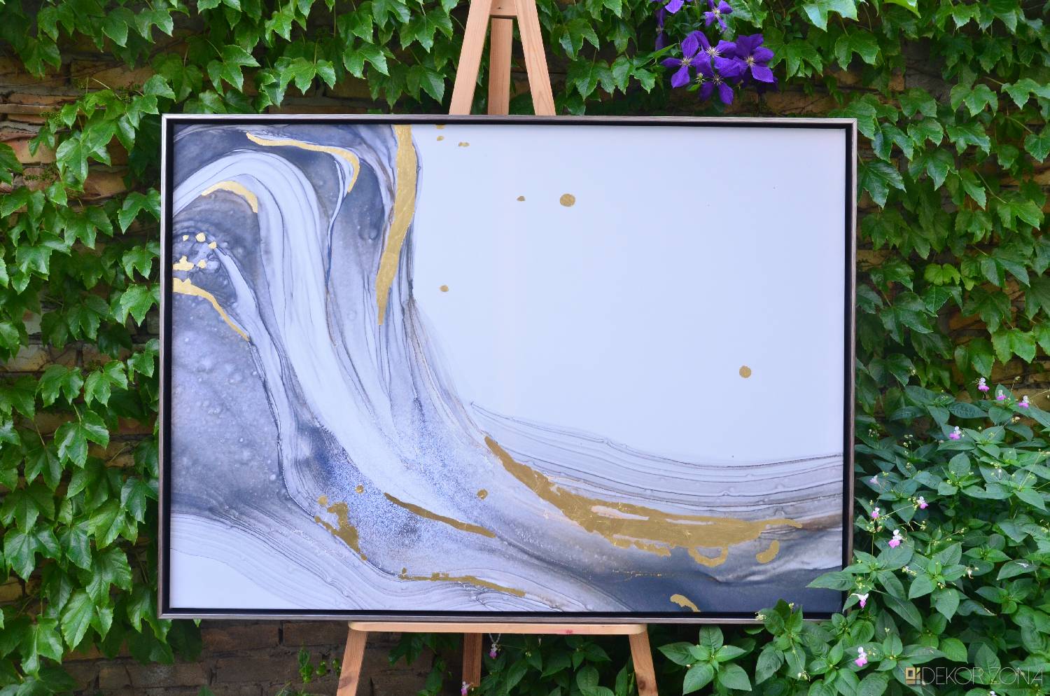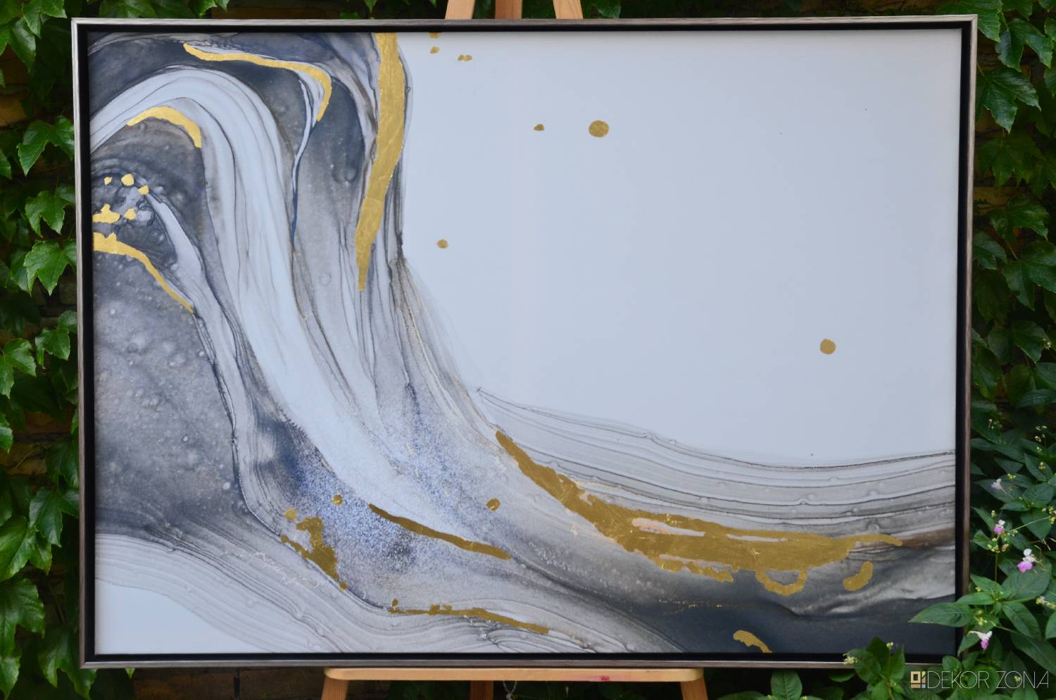 Apstraktni motiv inspirisan pokretom talasa u sivo-belim tonovima, oplemenjen ručno nanošenim zlatnim akcentima. Minimalistička, a istovremeno luksuzna kompozicija koja unosi mir, fluidnost i sofisticiran sjaj u svaki prostor.